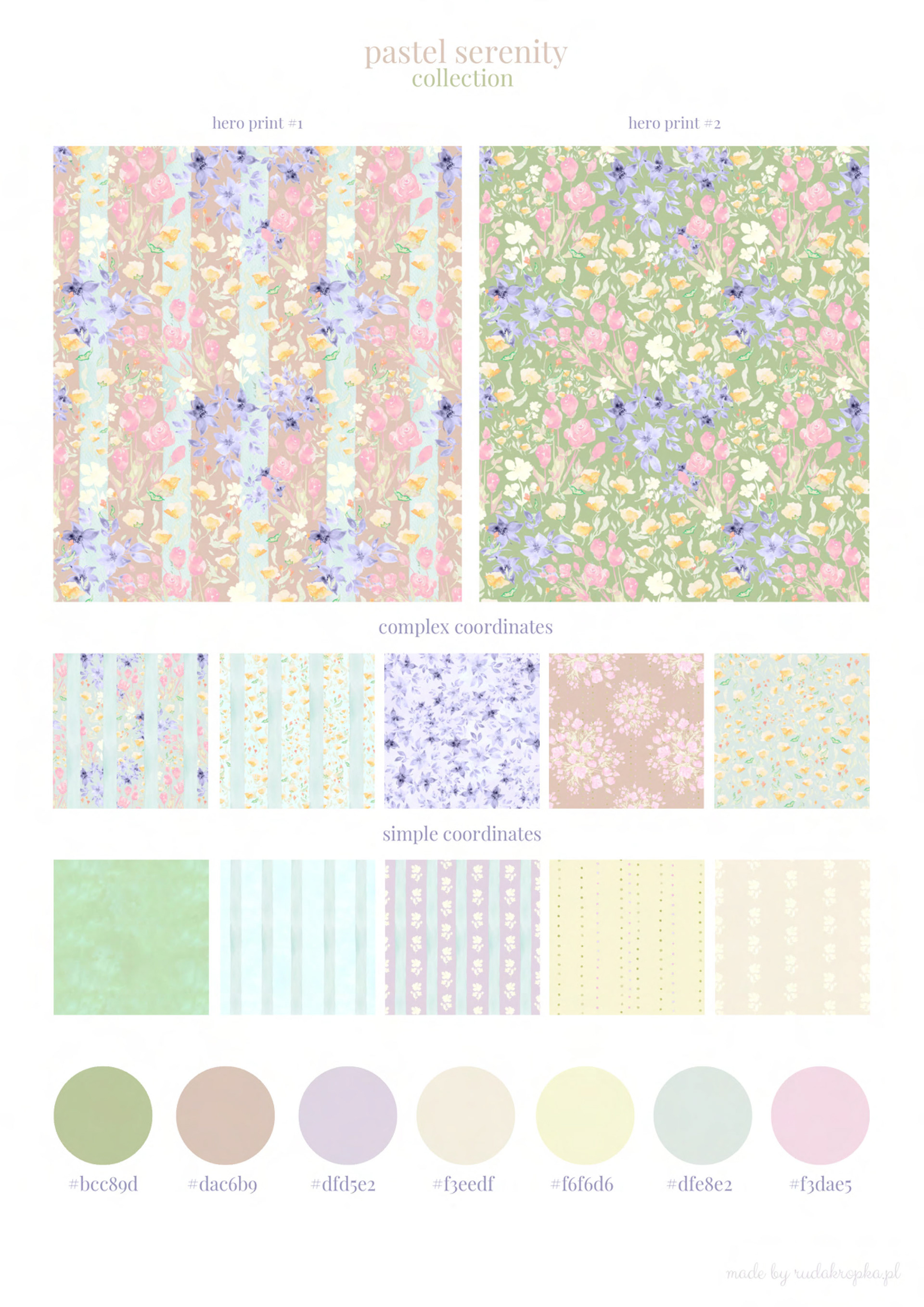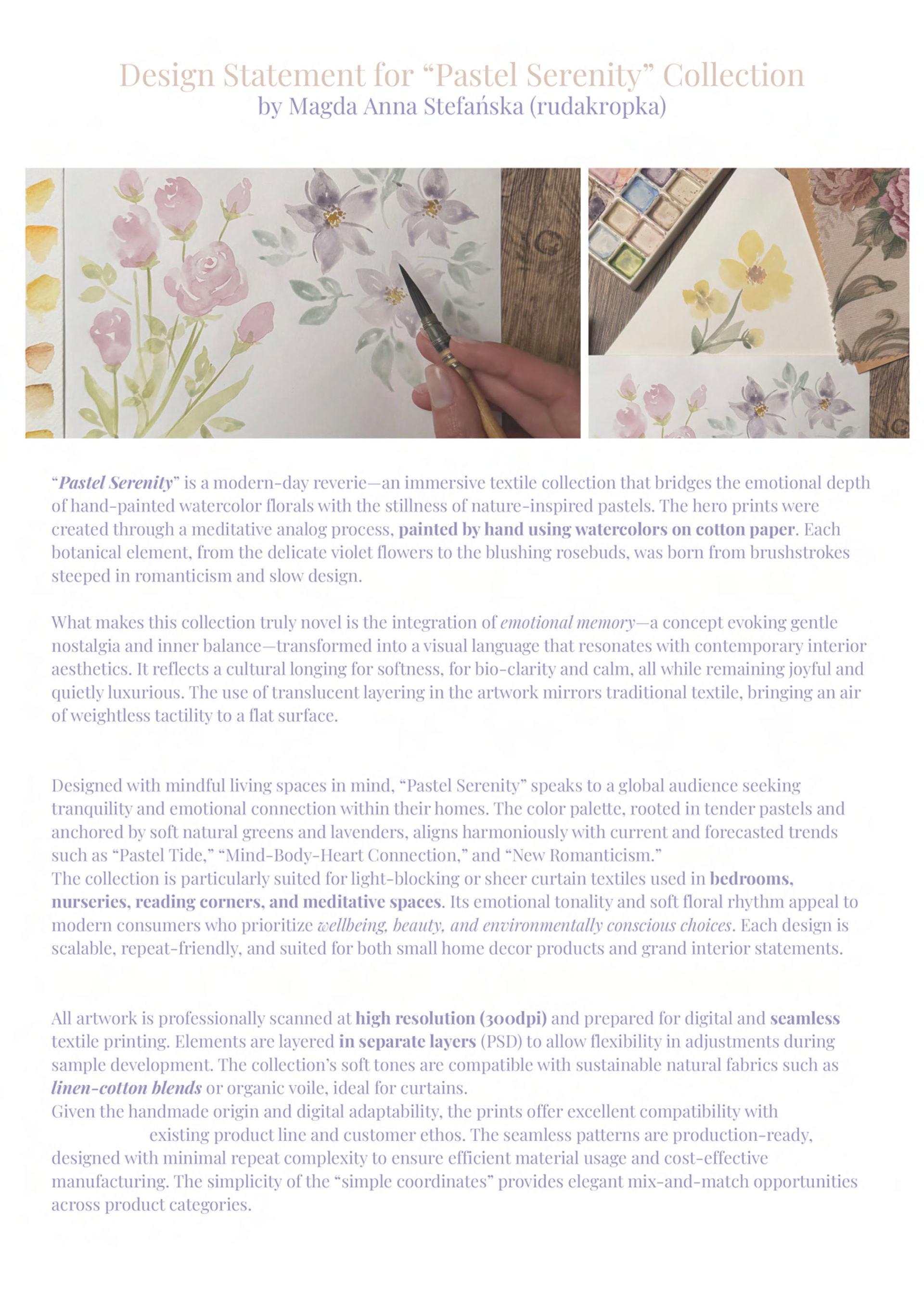 The collection consists of 12 coordinated patterns, each developed in multiple colorways — from expressive hero florals to subtle supporting prints. Together, they create a quiet visual rhythm inspired by softness, slow living, and bio-clarity.